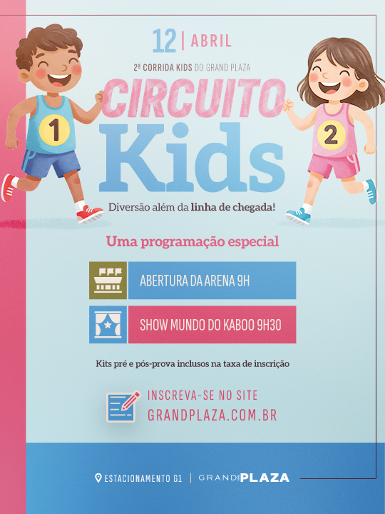 Vem aí a 2ª Corrida Kids do nosso Grand, um circuito feito para a criançada se divertir, correr e cruzar a linha de chegada com sorriso no rosto.